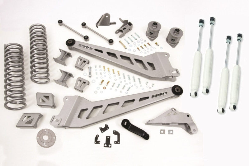 Kit Includes: (2) Radius Arms, (2) Rear Bump Stop Extenders, (2) Front Bump Stop Extenders, (2) Coil Spacers, (2) Front Shocks & (2) Rear Shocks, (2) Coil Springs, (2) Sway Bar Drop Down, (2) Sway Bar Endlinks, (2) Brake Line Brackets, (1) Pitman Arm, (1) Track Bar Relocation Bracket