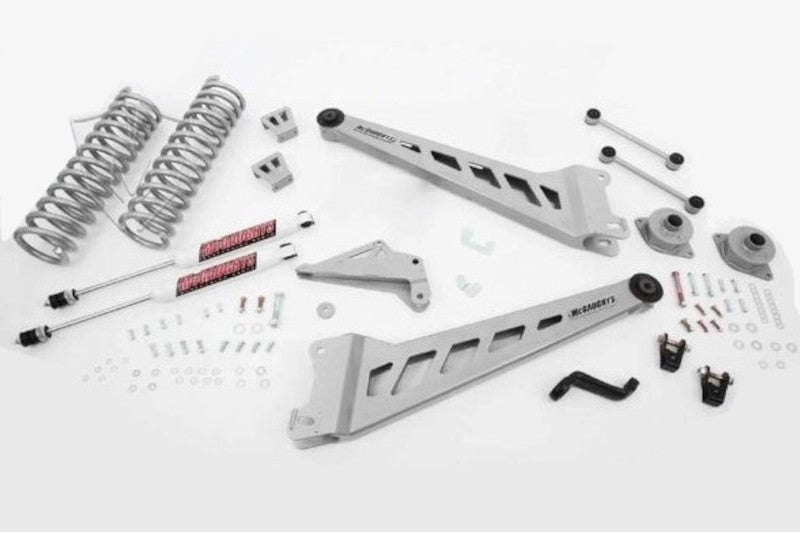 The McGaughys 54340 4 Inch Lift Kit is designed specifically for 2014-2018 RAM 2500 4WD trucks and includes all the key components to maintain proper suspension geometry and ride performance. At the core are two heavy-duty radius arms that ensure alignment stays tight under stress while improving overall front-end control. The included front coil springs and coil spacers deliver the full 4 inches of lift without compromising load support or ride comfort. A track bar relocation bracket and pitman arm work together to correct steering angles, minimizing bump steer and keeping your handling sharp. Front and rear bump stop extenders prevent over-compression, while new sway bar end links and brake line brackets help maintain factory-like function across all moving parts. This kit even includes front shocks tuned for the new ride height to ensure consistent damping and ride quality. Every piece is powder-coated silver for a clean finish that resists corrosion and complements the performance beneath your truck.
