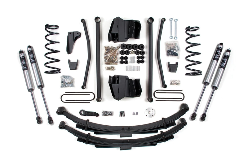 Up front the lift kit includes gas-specific Pro-Ride coil springs, all four control arms plus mounting bracket, forged drop pitman arm and track bar bracket for steering correction, bump stops, sway bar links, and FOX 2.0 nitrogen charged shocks. In the rear this kit utilizes heavy duty cast steel blocks, longer u-bolts, and a matching set of FOX 2.0 Performance shocks.