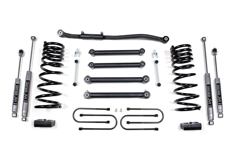 Up front the lift kit includes gas-specific Pro-Ride coil springs, heavy duty adjustable track bar, fixed length tubular upper and lower control arms, fixed length sway bar links with stud eliminator, and precision tuned NX2 shocks. In the rear this kit utilizes heavy duty cast steel blocks, longer u-bolts, and a matching set of NX2 Nitro shocks.
