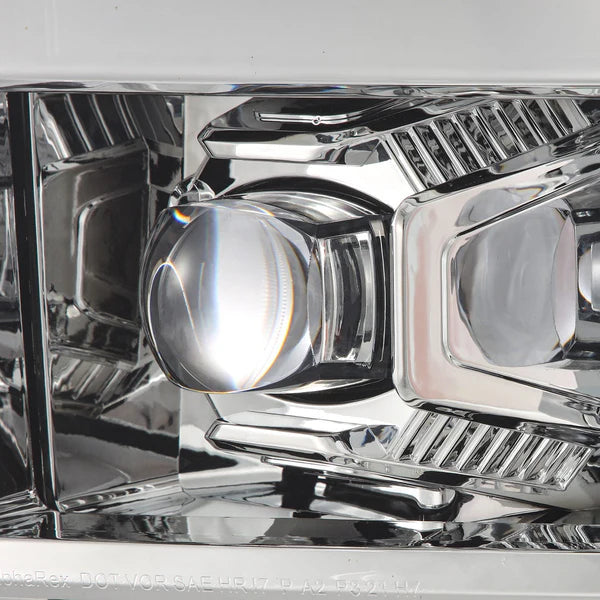 Elevate your Chevrolet Silverado 1500's style and safety with the AlphaRex NOVA-Series LED Projector Headlights in Chrome. Crafted with precision and attention to detail, these headlights are a perfect blend of form and function. The durable polycarbonate lenses are not only robust but also feature an anti-fog and anti-yellowing coating, ensuring optimal visibility even in adverse weather conditions. What sets these headlights apart is their quad projector design, where the top two projectors serve as low beams, and the bottom two projectors deliver high beams. The full LED light output is not only energy-efficient but also provides superior illumination on the road, enhancing your driving experience and safety. Furthermore, compliance with SAE and DOT FMVSS108 regulations ensures that these headlights meet the highest quality and safety standards, giving you peace of mind while on the road. Furthermore, they're certified to ISO-9000, ISO-9001, and ISO-9002, reflecting our commitment to product excellence.