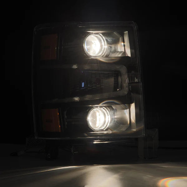 Elevate the look and performance of your 2014-2015 Silverado 1500 with the AlphaRex PRO-Series Halogen Projector Headlights in striking black. Engineered with cutting-edge projector technology, these headlights feature a patented rectangular projector lens, ensuring a flawless projection cut-off line that aligns perfectly with American LHD regulations. Illuminate the road with confidence as these lights are meticulously designed for optimal visibility. Equipped with a sequential turn signal light and a distinctive DRL light tube. these lights easily enhances both the style and functionality of your ride. The seamless integration of these features adds a touch of sophistication to your Silverado, making a bold statement on the road. Furthermore, the black housing exudes a sporty vibe, effortlessly complementing any color truck and front grill. Powered by H7 halogen bulbs for both low and high beams, these headlights provide reliable and efficient lighting performance, giving your Silverado a distinctive 4th gen aesthetic.