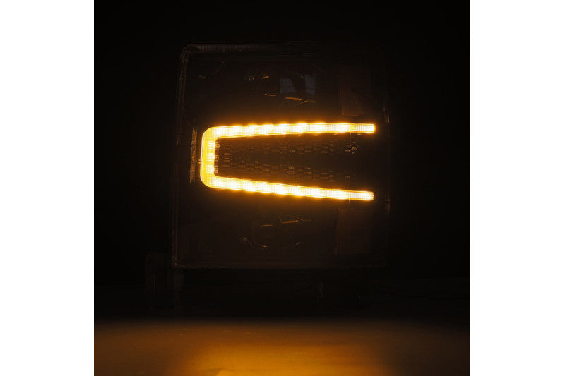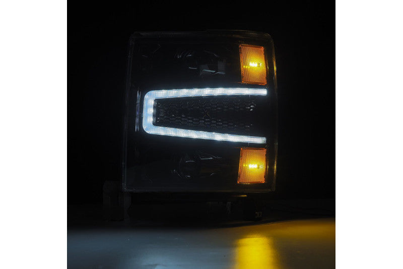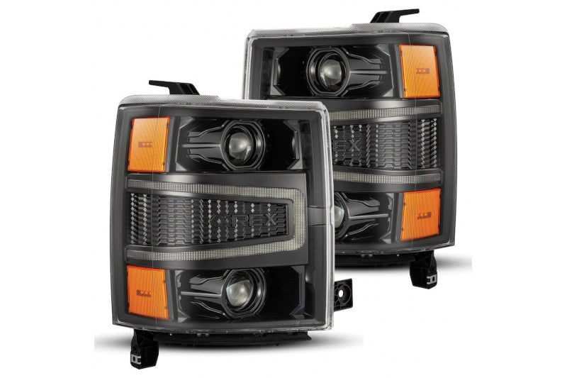 Elevate the look and performance of your 2014-2015 Silverado 1500 with the AlphaRex PRO-Series Halogen Projector Headlights in sleek alpha-black. Engineered with cutting-edge projector technology, these headlights feature a patented rectangular projector lens, ensuring a flawless projection cut-off line that aligns perfectly with American LHD regulations. Illuminate the road with confidence as these lights are meticulously designed for optimal visibility. Equipped with a sequential turn signal light and a distinctive DRL light tube. these lights easily enhances both the style and functionality of your ride. The seamless integration of these features adds a touch of sophistication to your Silverado, making a bold statement on the road. Furthermore, the alpha-black housing exudes a sporty vibe, effortlessly complementing any color truck and front grill. Powered by H7 halogen bulbs for both low and high beams, these headlights provide reliable and efficient lighting performance, giving your Silverado a distinctive 4th gen aesthetic.