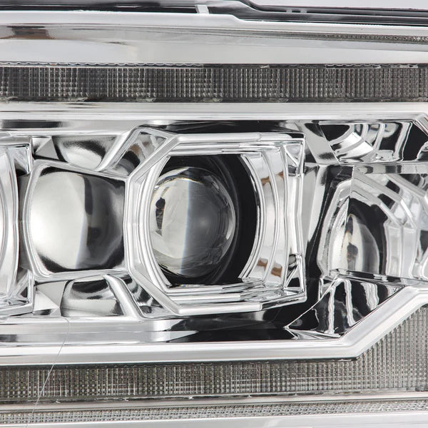 Upgrade your 2010-2018 Ram HD with the AlphaRex MK II LUXX-Series LED Projector Headlights in a sleek chrome finish, offering a perfect blend of style, innovation, and functionality. Inspired by the 5th generation Ram 2500 trucks, the design of these LUXX-Series projector headlights seamlessly translates to the 4th generation Ram. The headlights feature white DRL and sequential turn signal lights at the top and middle DRL bars, accompanied by amber LED sequential turn signal lights at the bottom. The activation light, a captivating sequence upon unlocking your vehicle, adds a touch of sophistication. The high/low beam projectors, powered by LED chips developed in-house, deliver exceptional performance. Additionally, the chrome housing exudes a sporty vibe, effortlessly complementing any truck color and front grill.