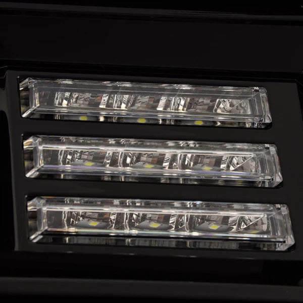 These GMC Sierra PRO-series projector headlights come with the signature activation light feature, which is a sequential light show when you unlock your car, as well as DRL and sequential signal light tube. Please select the model and feature on the top when you purchase the lights. We compose these GMC Sierra PRO-series projector headlights with our patented rectangular projector lens. The projection cut-off line is perfect for American LHD regulation. Our GMC Sierra PRO-series projector headlights come with black and alpha-black housing. The black housing gives your truck a sporty look and easily match with any color truck and front grill. On the other hand, the alpha-black housing is our special designed housing that has the glossy look mixed with the black paint and smoked DRL light tube, and it will give your truck a sporty and luxury look at the same time. Read this article to learn more detail about our headlights color housing.