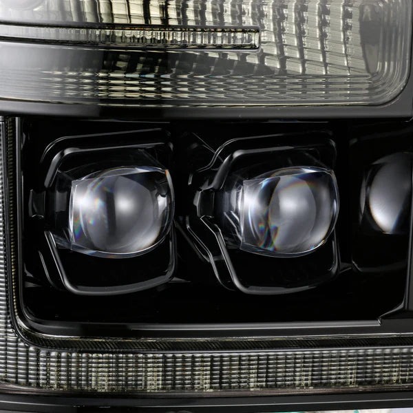 Underneath the sleek Alpha-Black housing, the NOVA-Series headlights pack some serious tech that sets them apart. You’re looking at a quad projector setup that uses AlphaRex’s 3D Ice-Cube lens system, powered by Osram Black Flat LED chips to deliver crisp, focused light with a 6000K color temperature. The outer three projectors handle low beams, while the inner projector takes care of high beam duties, all tuned for excellent beam cutoff that complies with LHD specs. The T-shaped LED DRL tube doubles as a switchback signal, giving you both style and functionality in one clean package. There's also a clear lens detail in the middle of the headlight face, a subtle nod to the updated look of newer Super Duty models. Each unit is made from durable polycarbonate with anti-fog and anti-oxidation coatings to stand up against the elements. These headlights come ready to install with a plug-and-play harness, no cutting or modification required. From daily driving to night runs on the back roads, they’re built to handle it all.