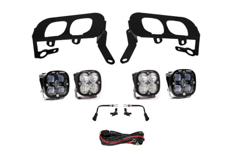 This kit is Utilizing our newly released SAE compliant fog lights on the outside, controlled by the factory fog switch, and a pair of driving/combo lights inside, operated by a secondary harness. If you're looking to add not only safety but lighting performance this is your kit! x2 Squadron Sport: Baja Designs Features: