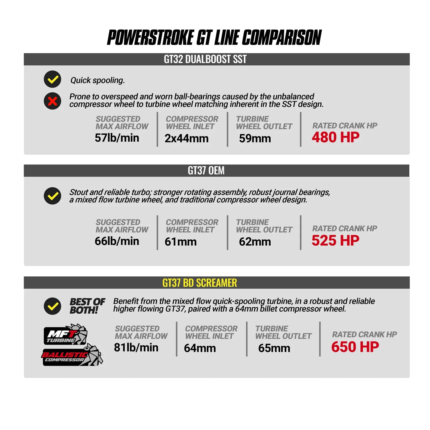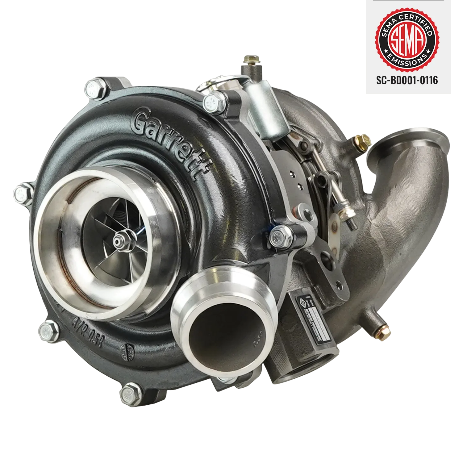 At the heart of this turbocharger lies a 64.0mm Billet compressor wheel paired with a custom mixed flow turbine (MFT) wheel featuring a large 65mm exducer, propelling the Screamer to deliver up to 81lb/min of airflow. This combination not only increases turbine flow but also enhances efficiency, resulting in more boost, reduced drive pressure, and lower exhaust gas temperatures (EGTs). Additionally, the Screamer is constructed from a brand new Garrett Turbo and is VSR high speed balanced, ensuring both reliability and longevity. Remarkably, it achieves these performance enhancements without the need for additional tuning and without triggering engine codes, making it the perfect upgrade for enthusiasts seeking to boost their Powerstroke's capabilities without compromising drivability.