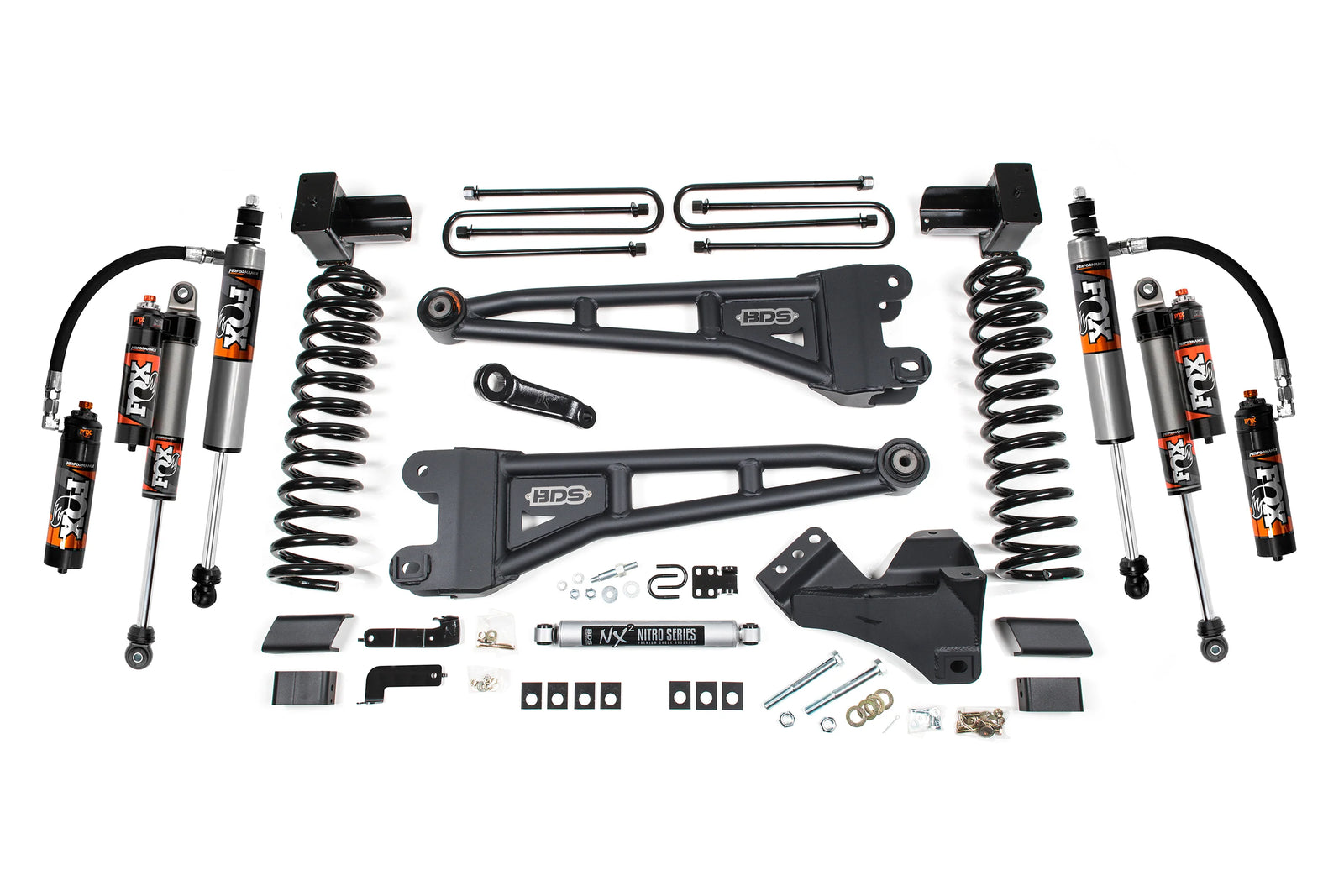 If you’re ready to take your 2017-2019 Ford F250 or F350 Super Duty diesel to the next level, this BDS 4-inch lift kit is the upgrade you’ve been waiting for. It doesn’t just give your truck the height to clear up to 37-inch tires, it gives you the performance and confidence to match. Whether you're towing on weekdays or trail running on the weekends, this setup has the muscle to keep up with your demands. The included FOX 2.5 Performance Elite shocks with external reservoirs soak up bumps and chatter, giving you a controlled, smooth ride no matter the terrain. The DSC adjusters are a game changer, letting you fine-tune shock response for comfort, load, or speed. And with a leveled stance from front to rear, your truck will look as good as it performs. Best of all, the kit bolts on clean with no cutting, so you can get back on the road or trail faster.