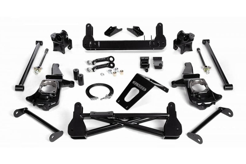 This kit is a non-torsion bar drop design which keeps the torsion bars in their original location rather than hanging down under the chassis. Front track width is increased by 1.2 Inch per side in order to retain proper caster settings and functional electronic stabilizing control (if StabiliTrak equipped).