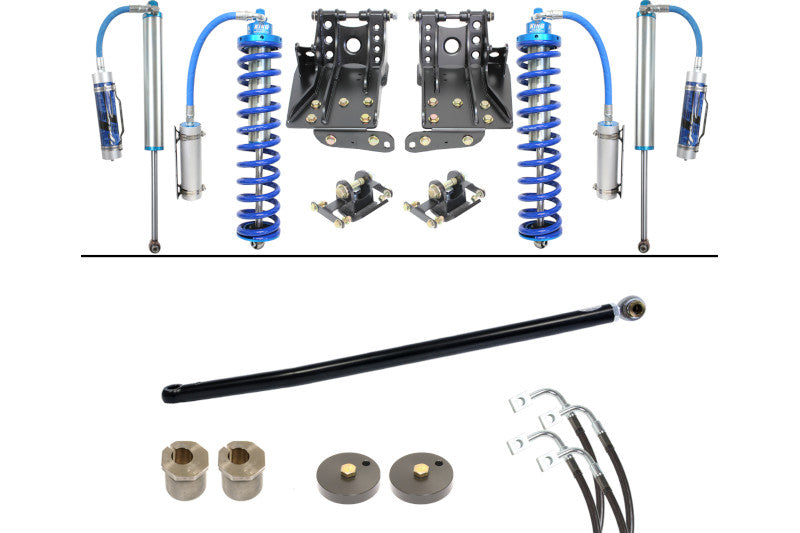 Base Kit Includes: King Front RR Coilovers, King Rear Piggyback RR Shocks, Reservoir Mounts, Coilover Mounts, Extended Brake Lines, Correction Shims, Front Bump Stop Drops, and Adjustable Track Bar.