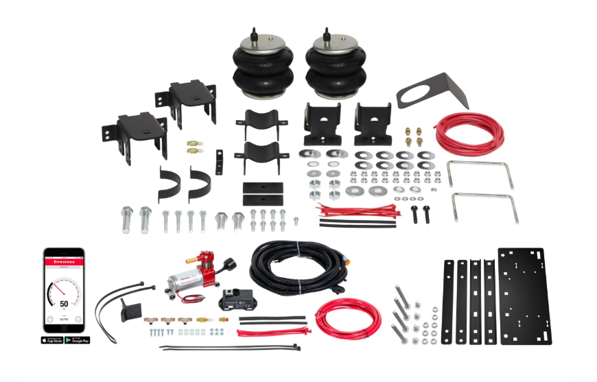 If you’ve ever watched your truck squat under the weight of a trailer or heavy bed cargo, you know that sag isn’t just about looks, it affects handling, braking, and overall safety. That’s where the Firestone 2864 Rear All-In-One Wireless Air Spring Kit steps in to take control. Built for 1999-2004 and 2008-2010 Ford F250 and F350 2WD and 4WD models, this kit brings serious load-leveling power without the need for permanent modifications. With wireless control options, you can easily adjust your air pressure from the comfort of the cab or while hooking up your trailer. Whether you're hauling a camper for the weekend or moving equipment for the job, the 5,000-pound capacity keeps your truck sitting level and stable. Installation takes about two and a half hours, and the no-drill design means you’re not punching holes in your frame. If your truck works as hard as you do, this kit gives it the support it deserves.