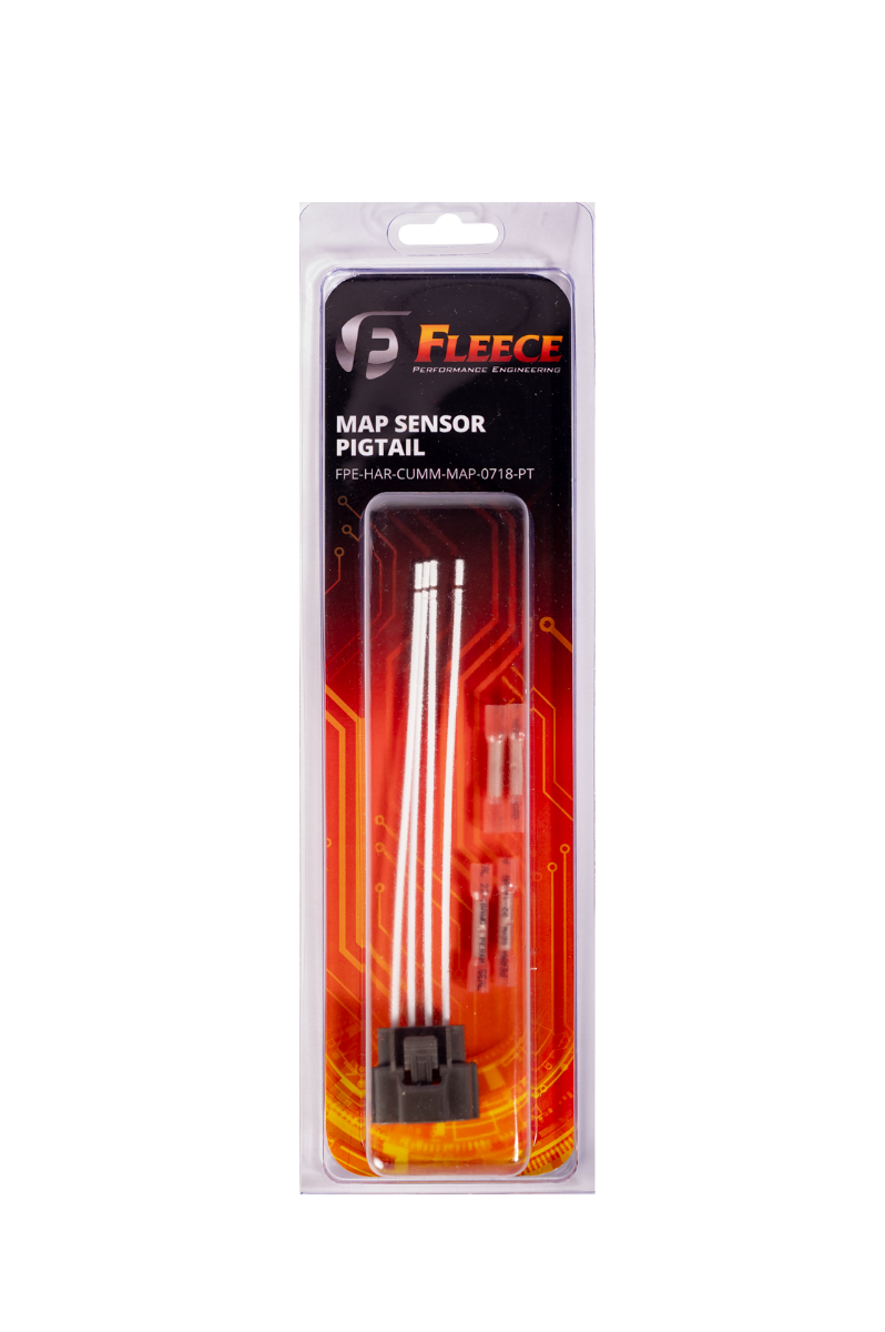 The Fleece FPE-HAR-CUMM-MAP-0718-PT MAP Sensor Pigtail is designed to restore proper communication between the engine control module and the MAP sensor on 6.7L Cummins trucks from 2007.5 to 2018. Produced in-house by Fleece Performance, each harness is manufactured using fully automated wire cutting and terminal crimping to ensure consistent quality and reliable electrical connections. It includes a 6-inch pigtail and heat-sealable butt connectors, allowing for a weather-tight and durable repair. This connector is compatible with Cummins MAP sensor part numbers 2897333NX and PAI-050634, as well as intake air temperature sensors 2897332NX and PAI-050624. By using high-grade materials and OEM-style terminals, this pigtail matches factory specifications and installs without guesswork. Whether you're repairing a worn connector or addressing voltage drop issues, this solution provides a clean, long-lasting fix. Backed by a 6-month limited parts warranty, it delivers dependable performance you can count on.