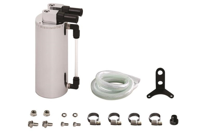 The Mishimoto Aluminum Oil Catch Can will prevent a harmful buildup of oil inside of the turbocharger, intake manifold, intercooler and piping. Our catch can prevents oil from getting into pressurized turbo plumbing and stops oil vapors from getting into the intake system that would ultimately lead to lower combustion temperatures and reduced overall efficiency. The polished Mishimoto Aluminum Oil Catch Can comes complete as a kit containing a mounting bracket, hose, all necessary clamps, fittings, and mounting hardware, for a perfect upgrade in performance and aesthetics for your car.