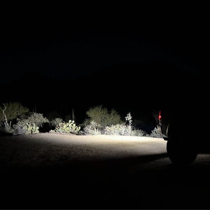 The Quatro Flood is designed for off-roaders who demand more than just brightness, it’s made for function, efficiency, and long-term durability. Each pair delivers a combined 8,166 effective lumens and uses a wide-area projection pattern to maximize near-field visibility. The beam is ideal for low-speed driving, recovery work, or utility lighting where spread and clarity are key. Behind the housing, a forced induction cooling system keeps internal temperatures in check by directing airflow through the light and out the back. The lights are built to handle the rough stuff too, with an IP68 waterproof rating, J575-certified vibration resistance, and impact-tested polycarbonate lenses that laugh off rocks, mud, and weather. Each light includes both amber and smoke covers that are easy to swap out without tools, giving you quick options for color and glare control. Designed, tested, and assembled in Mesa, Arizona, the Quatro Flood combines rugged American engineering with the versatility to meet any lighting need on or off the trail.