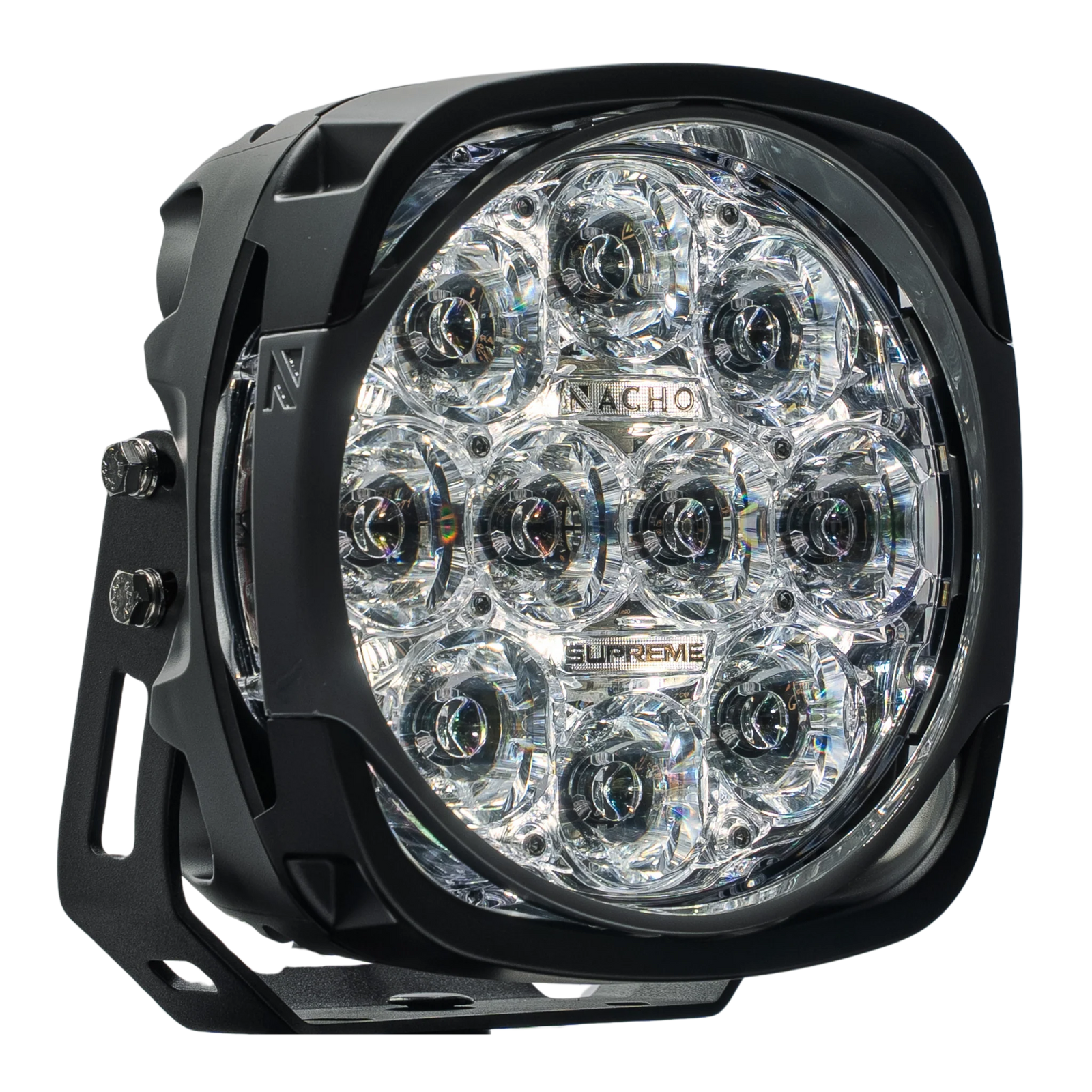 The Grande Supreme 150 is engineered for ultra-high-speed visibility with a powerful 140-watt setup and an intense 1,000,570 candela output. Designed specifically for race speeds between 110 mph and 150 mph, it offers a focused long-distance beam pattern while maintaining multi-function flexibility. It comes equipped with NACHO’s copper circuit board for advanced thermal efficiency, supported by internal thermal management software that keeps the system stable under extreme use. Drivers can program up to three custom light modes using the built-in Output Control Module and the included Sorcery Wand, toggling easily between spot, flood, and area lighting options. The constant power design simplifies wiring and eliminates the need for bulky relays or power-hungry switches. The housing features NACHO’s signature polycarbonate exoskeleton with forced air induction, keeping airflow moving and components cool. Built to withstand water, dust, and vibration, the Supreme 150 is both IP68 and J575 rated, making it ready for whatever punishment the trail or track can throw its way.