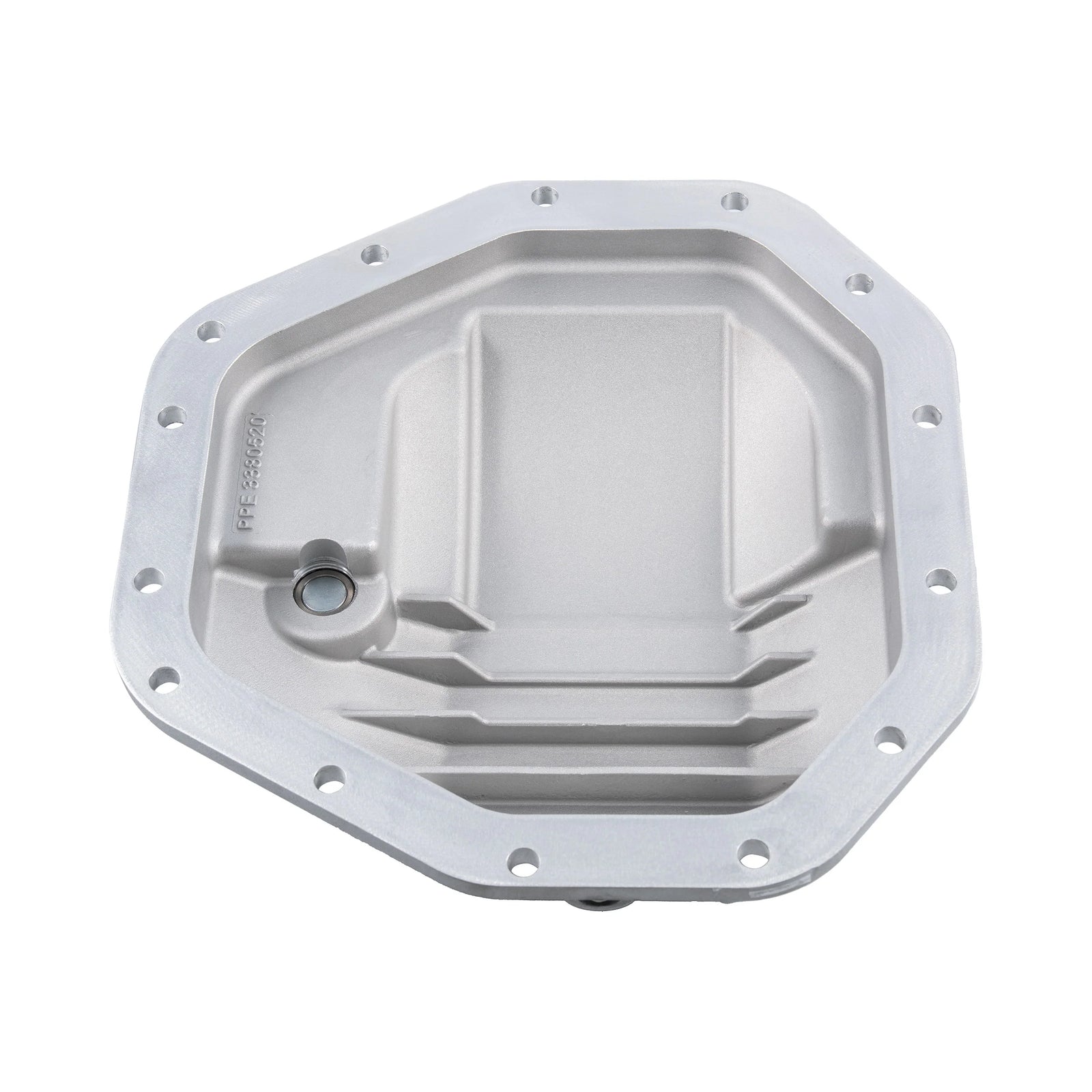 The PPE 338052000 rear differential cover is designed specifically for the Dana M275 axle found on 2017–2025 Ford F250 and F350 Super Duty trucks. It’s precision-cast using permanent steel molds, delivering a consistent, high-quality fit with improved dimensional accuracy. Made from A356.0-T6 heat-treated aluminum, the housing offers excellent thermal conductivity and strength over stamped factory covers. Internally, the windage scrapers are strategically placed to minimize fluid churning and foaming, which reduces unnecessary heat generation and helps maintain fluid integrity under load. Externally, the tall half-inch fins work alongside the scrapers to manage heat buildup and reinforce the overall structure with cross-bracing. Cast-in gussets add extra rigidity to the flange area, helping prevent flex and leaks under extreme conditions. Both fill and drain plugs are fitted with high-temperature-rated neodymium magnets and Viton O-rings, offering dependable sealing and filtration of harmful metal debris. This cover is a well-rounded solution for long-term drivetrain health, especially in demanding towing and off-road applications.