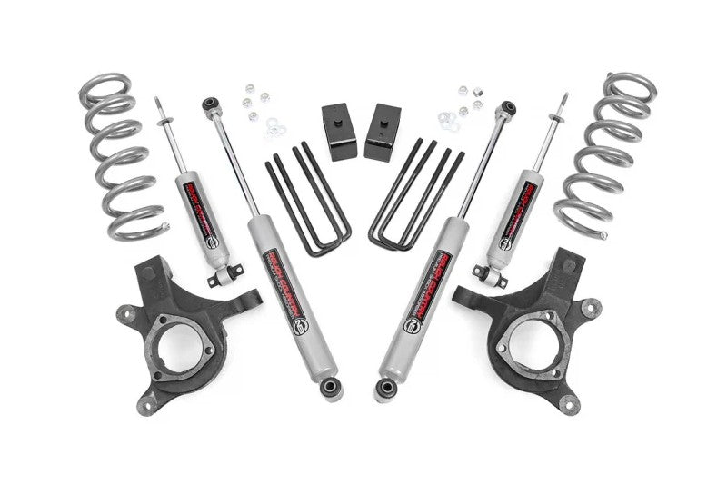 Take your truck on the road less traveled with Rough Country's new 4.5-inch N2 Suspension Lift for 2WD GM 1500 models. With this all-inclusive kit off-road action has never been more affordable! This kit includes two beefy front lift knuckles which maintain factory driveline angles for improved performance. Also included are a set of front lifted coil springs and rear lift blocks which help achieve an additional 4.5-inch of lift - enough to clear up to 33-inch tires! Most notably, this kit includes front and rear N2.0 shocks. Utilizing 10-stage velocity sensitive valving, Rough Country's N2.0 Shocks are application tuned; designed specifically for use with the GM 1500 setup to ride "more like stock" on the highway while offering superb off-road performance. Featuring a 100% bolt-on installation procedure, this kit is a cinch to install, requiring only minor trimming of the fender shroud for fitment with some larger tires. Taking your truck off the beaten path has never been easier or more affordable! Rough Country's 4.5-inch Suspension Lift Kit - 239N2