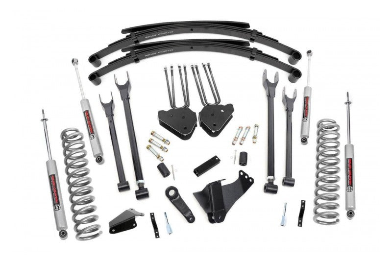 If you're ready to give your 6.0L Powerstroke the stance, clearance, and off-road capability it deserves, the Rough Country 590.20 8-Inch 4-Link Suspension Lift Kit is a serious upgrade worth considering. Built specifically for 2005–2007 Ford F-250 and F-350 Super Duty trucks, this kit doesn’t just crank your ride up a few inches—it transforms how it looks, feels, and performs on and off the road. One of the standout features of this system is its 4-link setup. By replacing the factory radius arms with a more advanced design, this kit helps preserve factory suspension geometry while dramatically improving articulation and strength. Paired with radius arm drop brackets and adjustable lower control arms, you’ll be able to dial in proper caster for factory-like handling, even with the lift.
