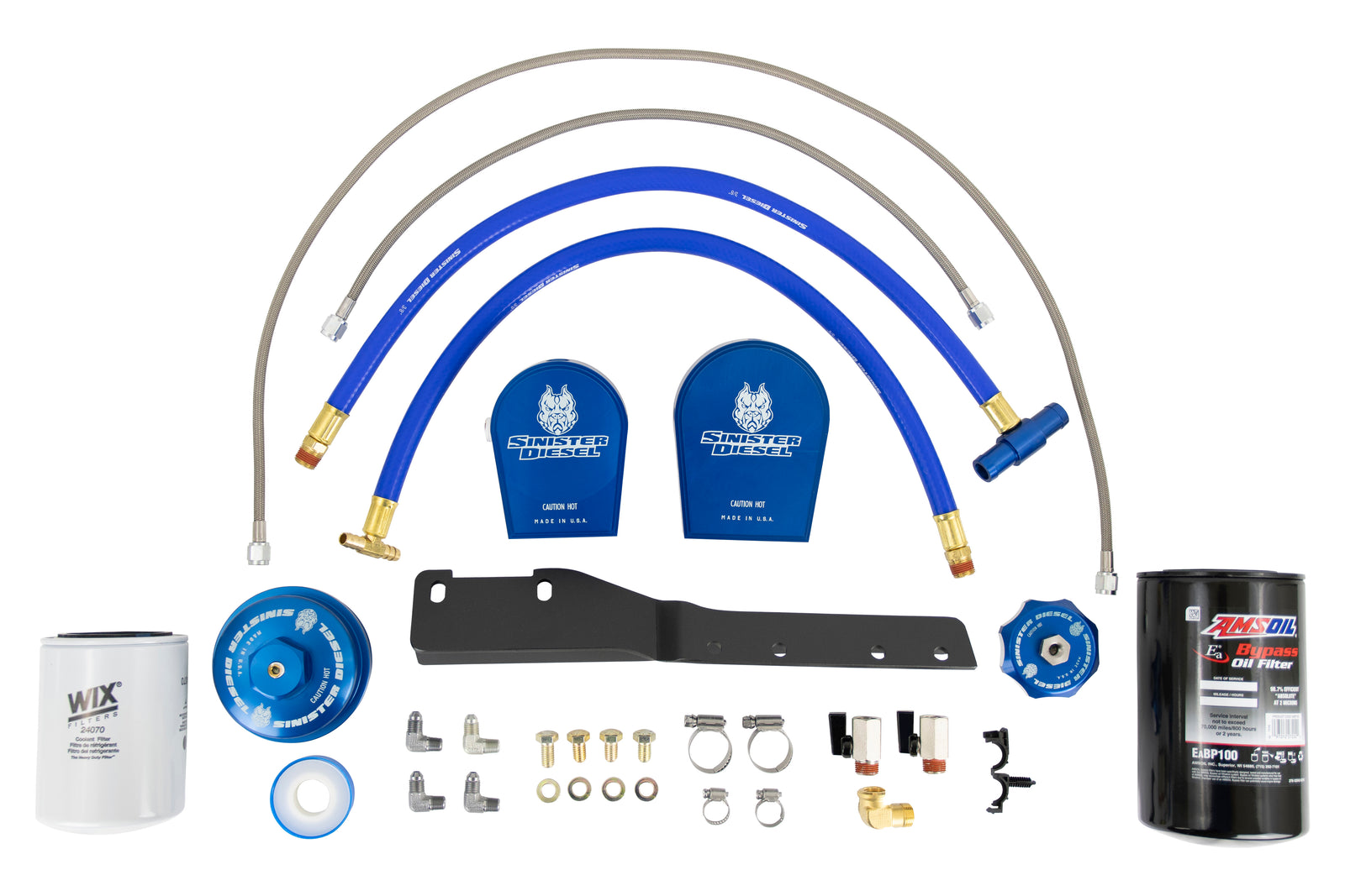 This Sinister Diesel Coolant Filter Oil Filter Kit includes all mounts and fittings needed for installation and is machined from 6061 billet aluminum. The filter boss includes 2 threaded inlet ports and 1 outlet port. We recommend replacement of the first filter at 500 miles and replacement of the second and third filters after 3,000 miles each. After three filter changes, replacement can be done once a year.
