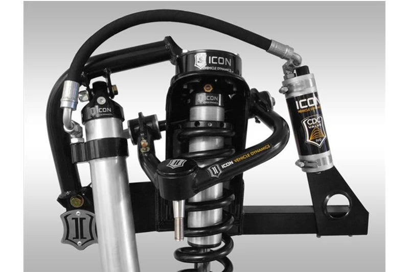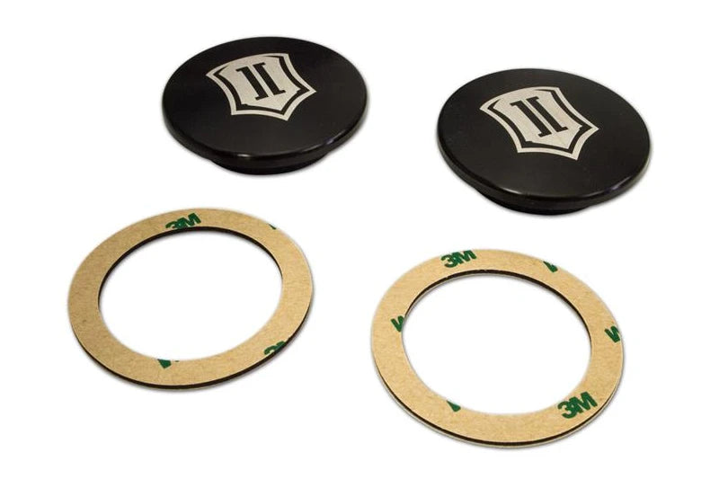 ICON Vehicle Dynamics tubular upper control arms do an exceptional job of adding strength and performance to your truck while also correcting suspension geometry and reducing OE balljoint bind in lifted applications. The 1" PTFE-lined stainless steel uniball that can be found in ICON upper control arms is a high-quality component, but its location on the vehicle leaves it vulnerable to all of the elements you may drive through including dirt, water, sand, road salts, etc. Always looking to make good things even better, ICON engineers took the uniball cap concept featured in our Billet Upper Control Arms and arrived at the easy-to-install and affordable solution that is the ICON Uniball Cover Cap Kit. These 6061 billet aluminum caps were designed exclusively for ICON tubular upper control arms and feature extremely durable 3M neoprene adhesive rings that attach them to the uniball cup. While our caps don't make our arms invincible to normal wear, they do a great job of extending the service life of the uniball by keeping the elements out that are usually attributed to premature PTFE-liner failure. The kit includes one pair of caps and two pairs of adhesive rings so that uniballs may be serviced regularly. Whether you are an avid off-roader looking to keep your vehicle in top working order, or you just want to increase the cosmetics of your inner fender well, this is the perfect add-on for you.